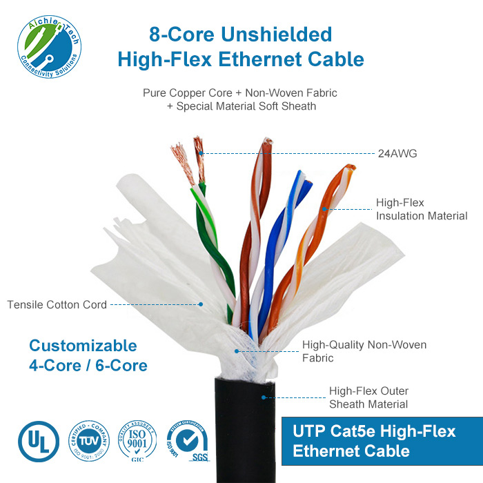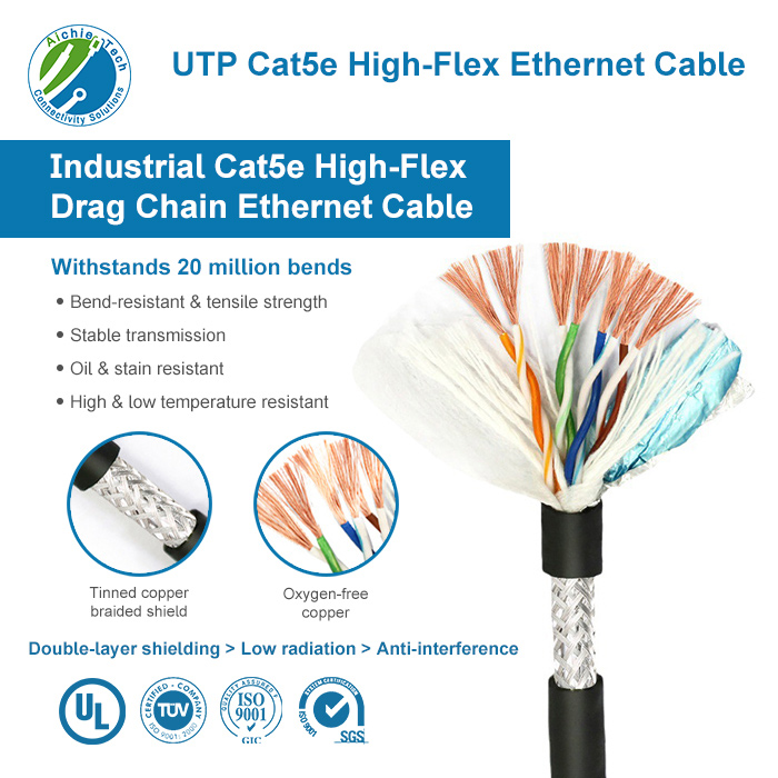 High-flex Cat5e drag chain cable for industrial automation. UL, ROSH, and ISO certifications. Customizable, stable signal, oil & bending resistant. Aichie factory OEM/ODM supported.