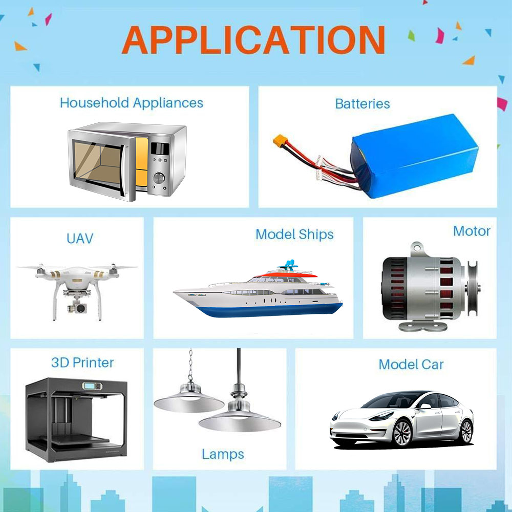 Household Appliances、Battery Packs、Drones (UAVs)、Model Ships、Motors、3D Printers、 Model Cars、Lamps & Lighting、Solar Inverters、Industrial Machines、Temperature Sensing Devices |
